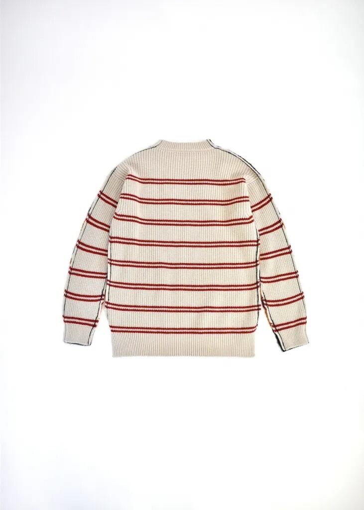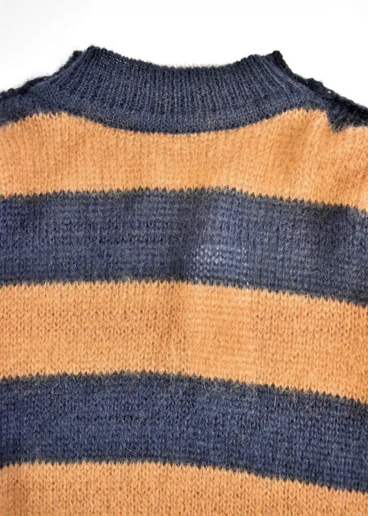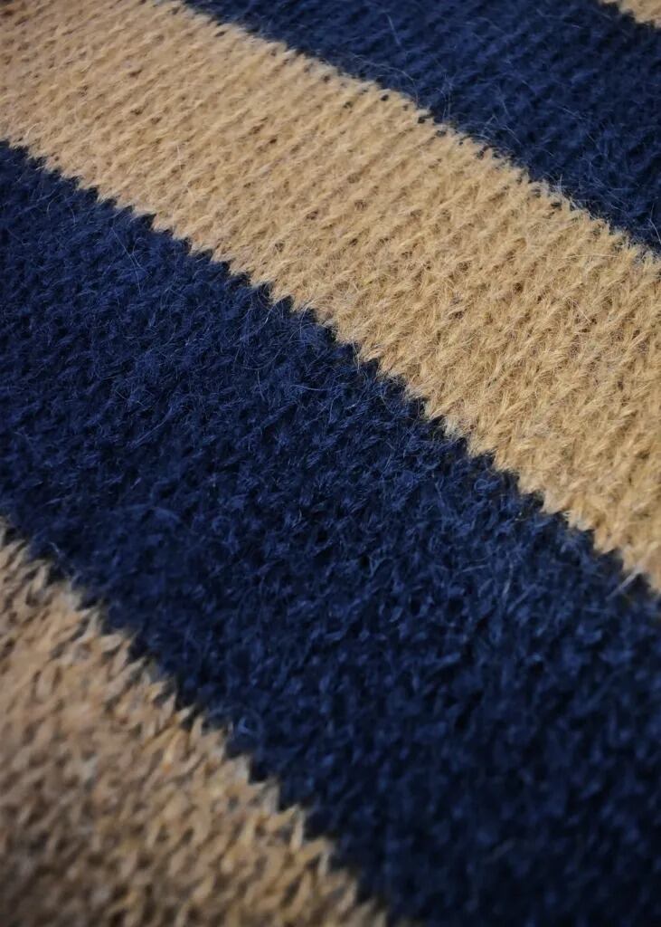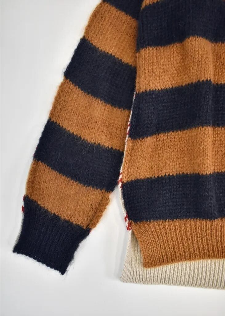 フロントとバックで異なるパターンのストライプ柄を合わせたウール×モヘア素材のボーダー柄ニット